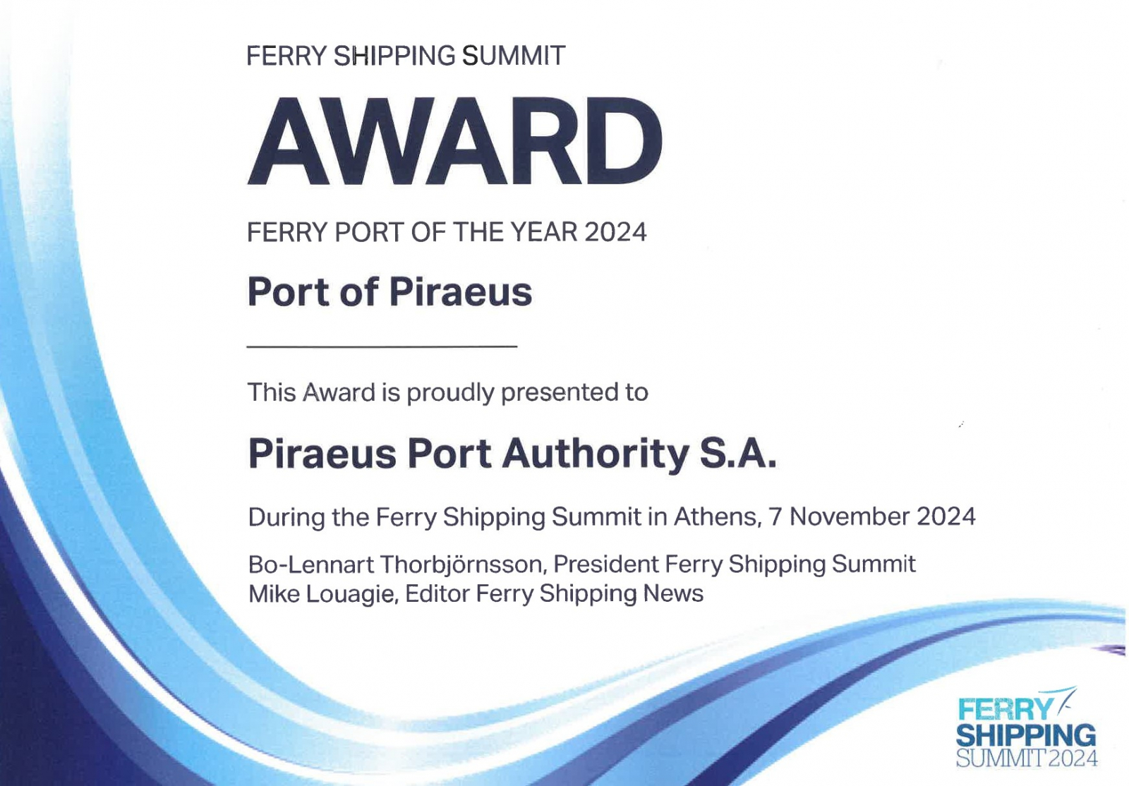 Το Λιμάνι του Πειραιά διακρίθηκε εκ νέου για τις επιδόσεις του στον τομέα της μεταφοράς επιβατών αυτή τη φορά, λαμβάνοντας το βραβείο «Ferry Shipping Port of the Year 2024», σε ειδική εκδήλωση, η οποία πραγματοποιήθηκε στο πλαίσιο της Ευρωπαϊκής Διάσκεψης για την Ακτοπλοΐα-European Ferry Shipping Summit.