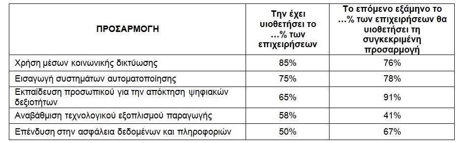 Από την έρευνα προέκυψαν οι πέντε κύριες προσαρμογές ψηφιακού μετασχηματισμού που έχουν ήδη υιοθετηθεί από τις μεταποιητικές επιχειρήσεις με έδρα την ελληνική περιφέρεια και η πρόθεση των επιχειρήσεων να συνεχίσουν να επενδύουν στις συγκεκριμένες προσαρμογές το επόμενο εξάμηνο: