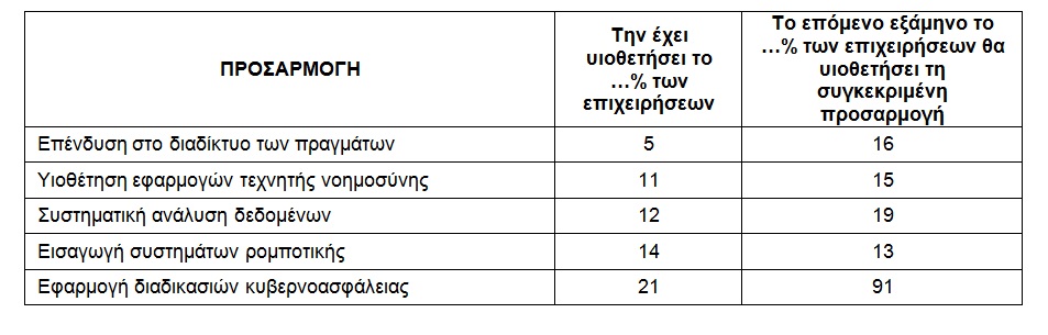 Πρωτοβουλίες, όπως η χρήση συστημάτων ρομποτικής, η υιοθέτηση εφαρμογών τεχνητής νοημοσύνης, οι επενδύσεις στο διαδίκτυο των πραγμάτων κ.λπ., φαίνεται ότι θα υιοθετηθούν από τη βιομηχανία, αλλά με αργούς ρυθμούς και σε βάθος χρόνου. Παρά ταύτα, αποτελεί θετικό μήνυμα για την ψηφιακή μετάβαση η εκπαίδευση και επιμόρφωση του προσωπικού της βιομηχανίας στις νέες τεχνολογίες.