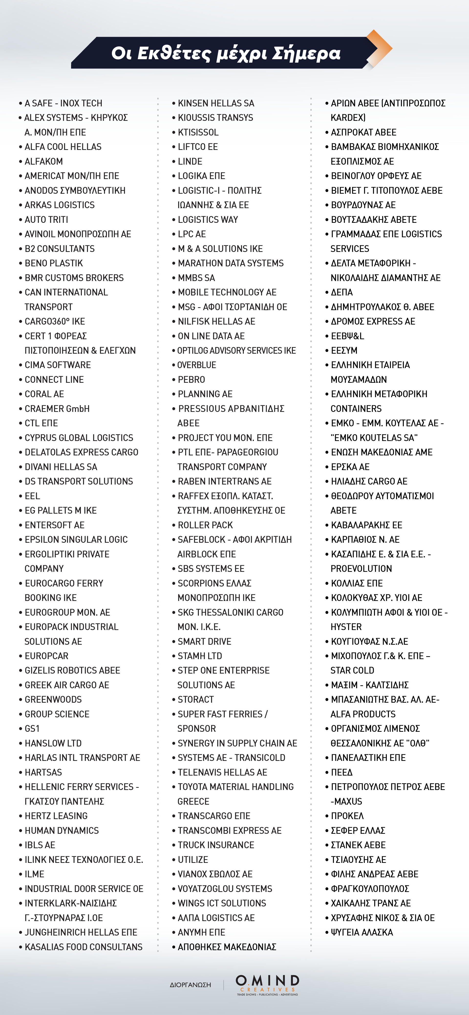 Στην μεγαλύτερη διοργάνωση της πολύχρονης (από το 2007) ιστορίας της, η μοναδική στο είδος της έκθεση για την Εφοδιαστική Αλυσίδα, τις Εμπορευματικές Μεταφορές, τον Επαγγελματικό Στόλο Οχημάτων, εκτείνεται ήδη σε 3 εκθεσιακές αίθουσες και φιλοξενεί μια σειρά μεγάλων ονομάτων από όλο το φάσμα της αγοράς: εταιρείες παροχής υπηρεσιών Logistics, μεταφορικές εταιρείες, εταιρείες εξοπλισμού αποθήκης, επιχειρήσεις εμπορίας συστημάτων διαχείρισης στόλου, τεχνολογίες μεταφορών, αντιπροσωπείες επαγγελματικών οχημάτων, όμιλοι παροχής υπηρεσιών AI & robotic solutions, είναι ήδη εκθέτες.