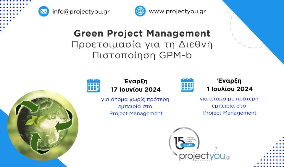 Η projectyou εύχεται σε όλους τους πιστοποιημένους Green Project Managers κάθε επιτυχία στην νέα τους πορεία και τους ενθαρρύνει να συνεχίσουν να είναι πρωτοπόροι στην εφαρμογή και την προώθηση πρακτικών που σέβονται και προστατεύουν το τρίπτυχο People – Planet – Prosperity!