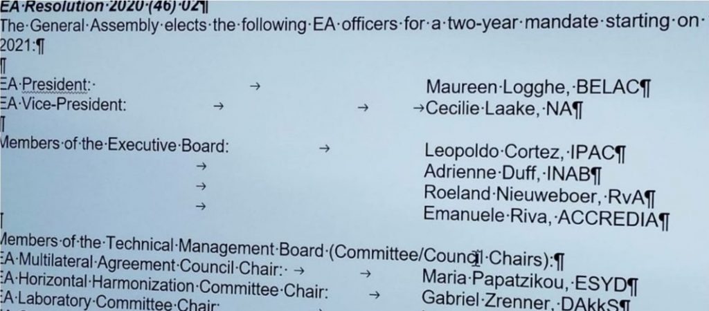 Με την υποστήριξη του Υπουργού Ανάπτυξης και Επενδύσεων, κ. Άδωνι Γεωργιάδη και μετά από πρόταση του Προέδρου του Ε.ΣΥ.Δ., κ. Κωνσταντίνου Κούρταλη και του Διευθύνοντος Συμβούλου, κ. Σπυρίδωνος Ποδάρα, η κα Μαρία Παπατζίκου, Υπεύθυνη Ποιότητας του Ε.ΣΥ.Δ, εκλέχτηκε στη θέση της Προέδρου του Ευρωπαϊκού Συμβουλίου για την Ευρωπαϊκή Αναγνώριση των Φορέων Διαπίστευσης – ΕΑ MAC, στο πλαίσιο της διαδικτυακής Γενικής Συνέλευσης της ΕΑ που πραγματοποιήθηκε στις 25 & 26 Νοεμβρίου 2020.