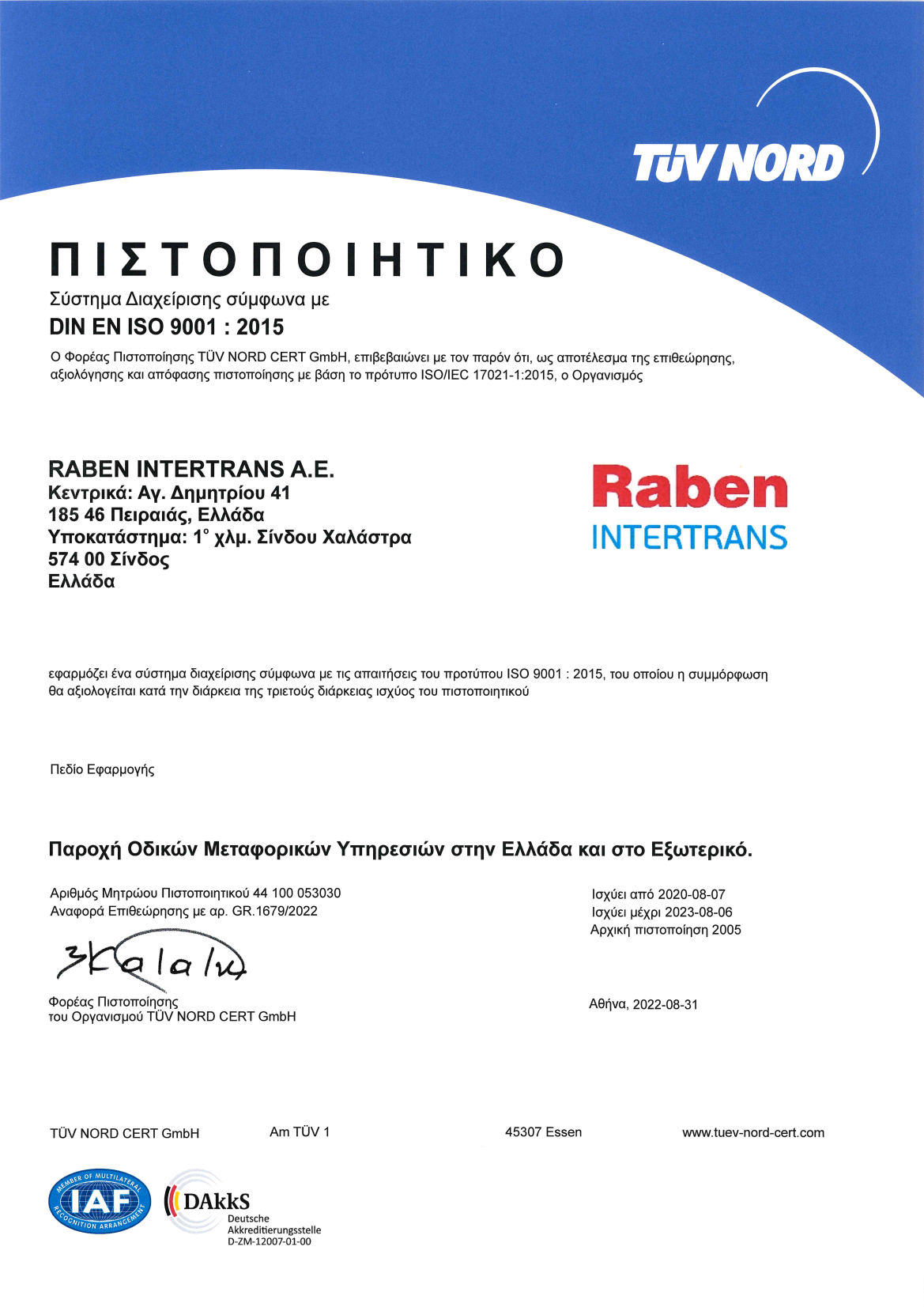 Συγκεκριμένα, στις 24 Αυγούστου του 2022,  επισκέφτηκαν τα γραφεία της  Raben INTERTRANS Α.Ε. επιθεωρητές της εταιρείας TÜV HELLAS (TÜV NORD) και διεξήγαγαν έλεγχο από τον οποίο προέκυψε η ανανέωση της πιστοποίησης της εταιρείας, η οποία αφορά στο πεδίο εφαρμογής «Παροχή Υπηρεσιών Μεταφοράς Εμπορευμάτων στο Εξωτερικό και στο Εσωτερικό».