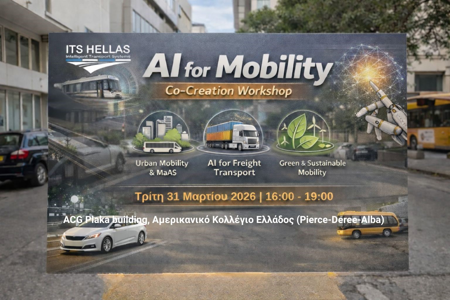 Ο ITS Hellas διοργανώνει το 1ο Εργαστήριο Συνδημιουργίας για την Τεχνητή Νοημοσύνη στην Κινητικότητα, εγκαινιάζοντας μια νέα, ουσιαστική πρωτοβουλία για τον τομέα των Ευφυών Συστημάτων Μεταφορών στην Ελλάδα. Το εργαστήριο θα πραγματοποιηθεί την Τρίτη 31 Μαρτίου 2026 στο ACG Plaka building, Αμερικάνικο Κολλέγιο Ελλάδος (Pierce-Deree-Alba)