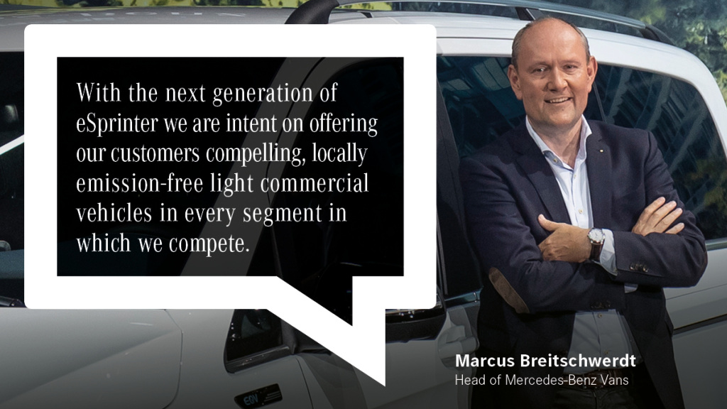 «Το eSprinter επόμενης γενιάς θα μας επιτρέπει να προσφέρουμε πολύ περισσότερες εκδόσεις αμαξώματος. Κατά συνέπεια, στο μέλλον, θα είμαστε σε θέση να ικανοποιούμε τις απαιτήσεις των πελατών σε πολλούς και διαφορετικούς κλάδους, ενώ ταυτόχρονα θα τους προσφέρουμε τα πλεονεκτήματα της οδήγησης με τοπικά μηδενικές εκπομπές. Το Sprinter αποτελεί εδώ και 25 χρόνια απτή απόδειξη των δυνατοτήτων μας στον τομέα των μεταφορών. Στο πεδίο της ηλεκτρικής κινητικότητας, έχουμε εισάγει πολλές καινοτομίες τα τελευταία χρόνια. Εφαρμόζοντας τη στρατηγική ταχύτατου εξηλεκτρισμού, συνδυάζουμε τα καλύτερα από δύο κόσμους – καινοτομία και εξειδίκευση!», ανέφερε ο Marcus Breitschwerdt, Επικεφαλής της Mercedes-Benz Vans.