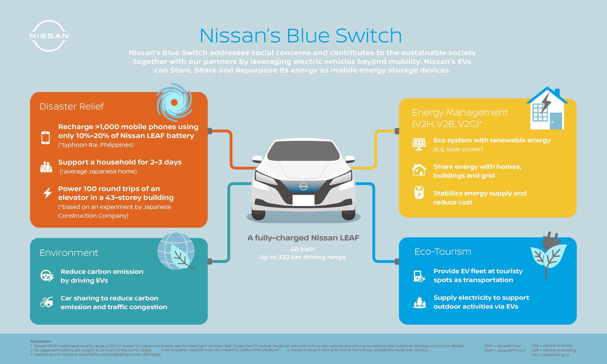 Η Nissan ανακοίνωσε πρόσφατα την επέκταση του προγράμματος Blue Switch στην περιοχή ASEAN. Το Blue Switch της Nissan αντιμετωπίζει τις κοινωνικές ανησυχίες αξιοποιώντας τις μοναδικές δυνατότητες των ηλεκτρικών οχημάτων (EVs) για σκοπούς πέρα από την κινητικότητα.