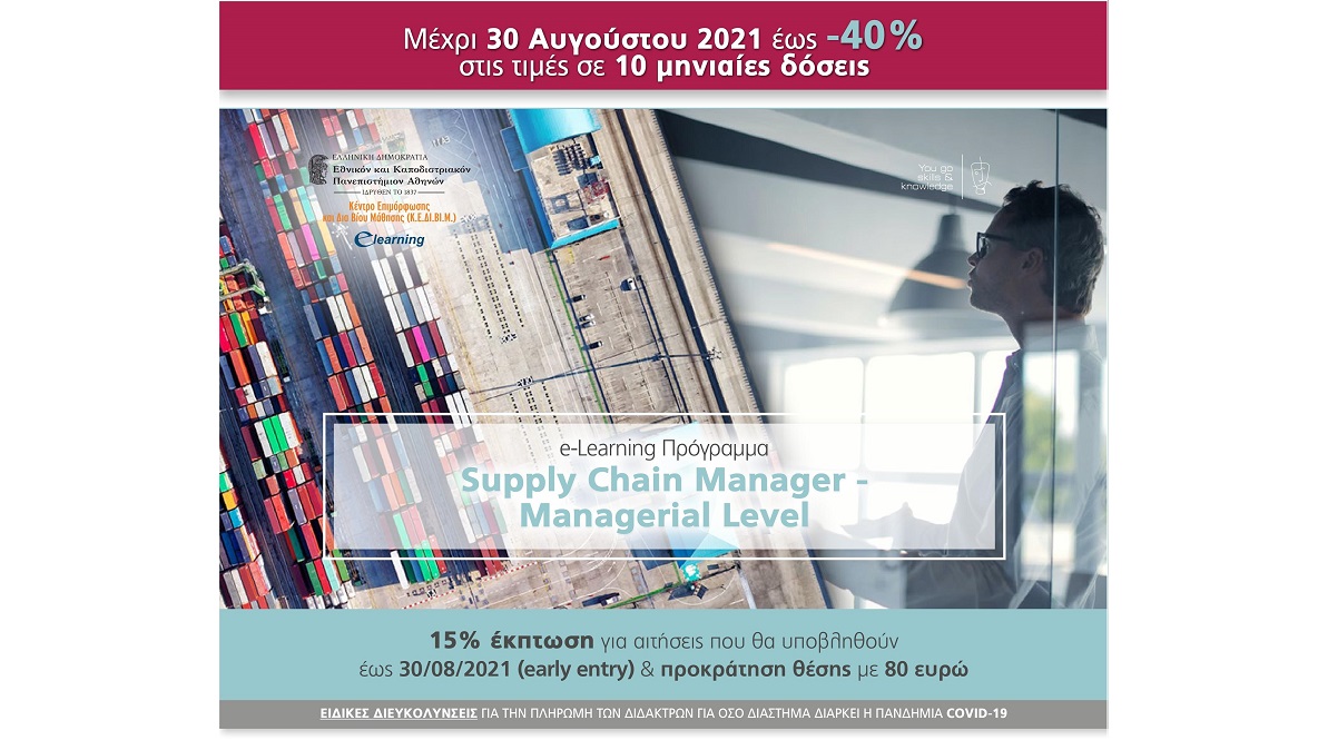 Το E-Learning του Κέντρου Επιμόρφωσης και Δια Βίου Μάθησης (ΚΕ.ΔΙ.ΒΙ.Μ.) του Εθνικού και Καποδιστριακού Πανεπιστημίου Αθηνών (Ε.Κ.Π.Α.) παρέχει τη δυνατότητα παρακολούθησης του νέου Προγράμματος Συμπληρωματικής εξ Αποστάσεως Εκπαίδευσης στο γνωστικό αντικείμενο «Supply Chain Manager – Managerial Level».