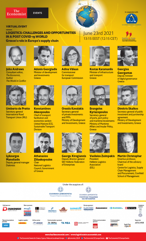 Με σημαντικούς ομιλητές και από τη διεθνή σκηνή, εκπροσώπους της ελληνικής Πολιτείας, εκπροσώπους φορέων και επιχειρήσεων, διεξάγεται στις 23 Ιουνίου το συνέδριο των Economist – EEL με τίτλο “Logistics: Challenges & Opportunities in a post-Covid 19 world – Greece’s role in Europe’s Supply Chain”, με χορηγό επικοινωνίας το SC&L magazine και το www.supply-chain.gr.