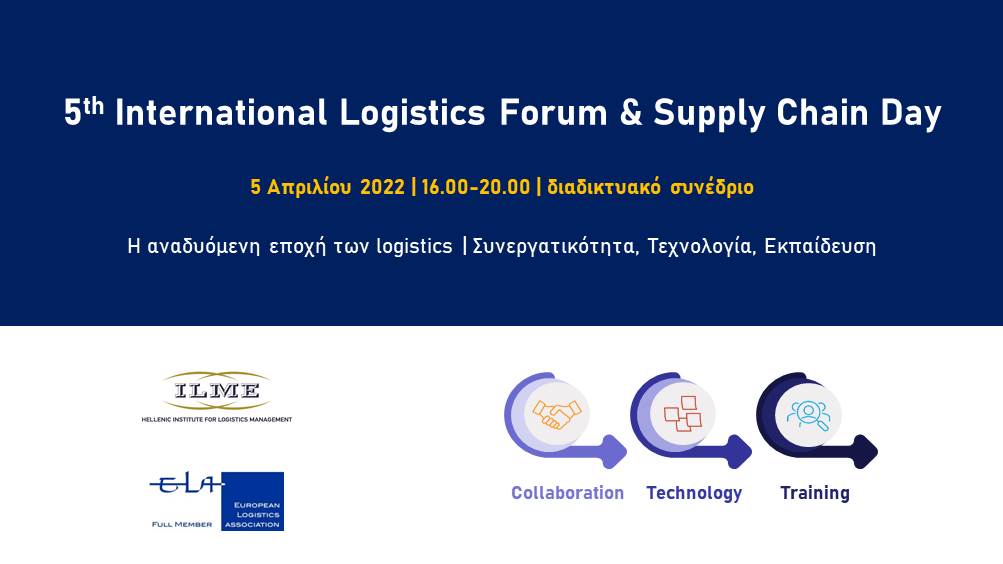 Με ιδιαίτερη χαρά το ILME σας προσκαλεί στο διεθνές διαδικτυακό συνέδριο 5th International Logistics Forum & Supply Chain Day στις 5 Απριλίου και ώρες 16:00-20:00, με θέμα «Η αναδυόμενη εποχή των Logistics | Συνεργατικότητα, Τεχνολογία, Εκπαίδευση». Θα συζητηθούν όλα τα φλέγοντα θέματα που απασχολούν τον κλάδο των logistics και της Εφοδιαστικής Αλυσίδας σήμερα αλλά και στο μέλλον.