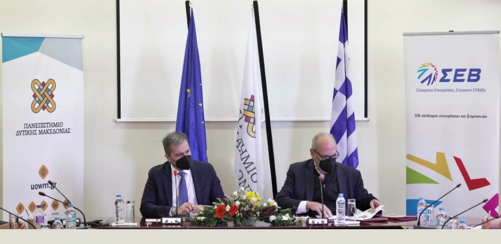 Συμφωνία συνεργασίας με πολλαπλά οφέλη τόσο για τους νέους, φοιτητές και ερευνητές, όσο και για τις επιχειρήσεις, ιδιαίτερα στην ελληνική περιφέρεια, υπέγραψαν οι διοικήσεις του Πανεπιστημίου Δυτικής Μακεδονίας και του ΣΕΒ, σε συνάντηση που πραγματοποιήθηκε στην πόλη της Κοζάνης στις 15 Απριλίου 2022. Η συμφωνία συνεργασίας στοχεύει στην ανάπτυξη κοινών πρωτοβουλιών για τη στήριξη της ανάπτυξης των επιχειρήσεων-μελών του ΣΕΒ αλλά της επιχειρηματικότητας ευρύτερα, την ενίσχυση της εφαρμοσμένης έρευνας, τη διασύνδεση των αποφοίτων του Πανεπιστημίου Δυτικής Μακεδονίας με την αγορά εργασίας και την υποστήριξη της πράσινης μετάβασης. Η συμφωνία εμπεδώνει την κοινή βούληση για πιο ουσιαστική διασύνδεση και συνεργασία πανεπιστημίων, ερευνητικών κέντρων και επιχειρήσεων-όπως, άλλωστε, συνέβη και με τις πρόσφατες συμφωνίες συνεργασίας με το Οικονομικό Πανεπιστήμιο Αθηνών, το ΕΜΠ, το ΕΚ Δημόκριτος, το ΔΠΘ, τα βιομηχανικά διδακτορικά στο Πανεπιστήμιο της Πάτρας, την πρακτική άσκηση σε μέλη του Συνδέσμου, αλλά και την ακαδημία AIMinds σε συνεργασία με την SAS σε διάφορα ΑΕΙ της χώρας.