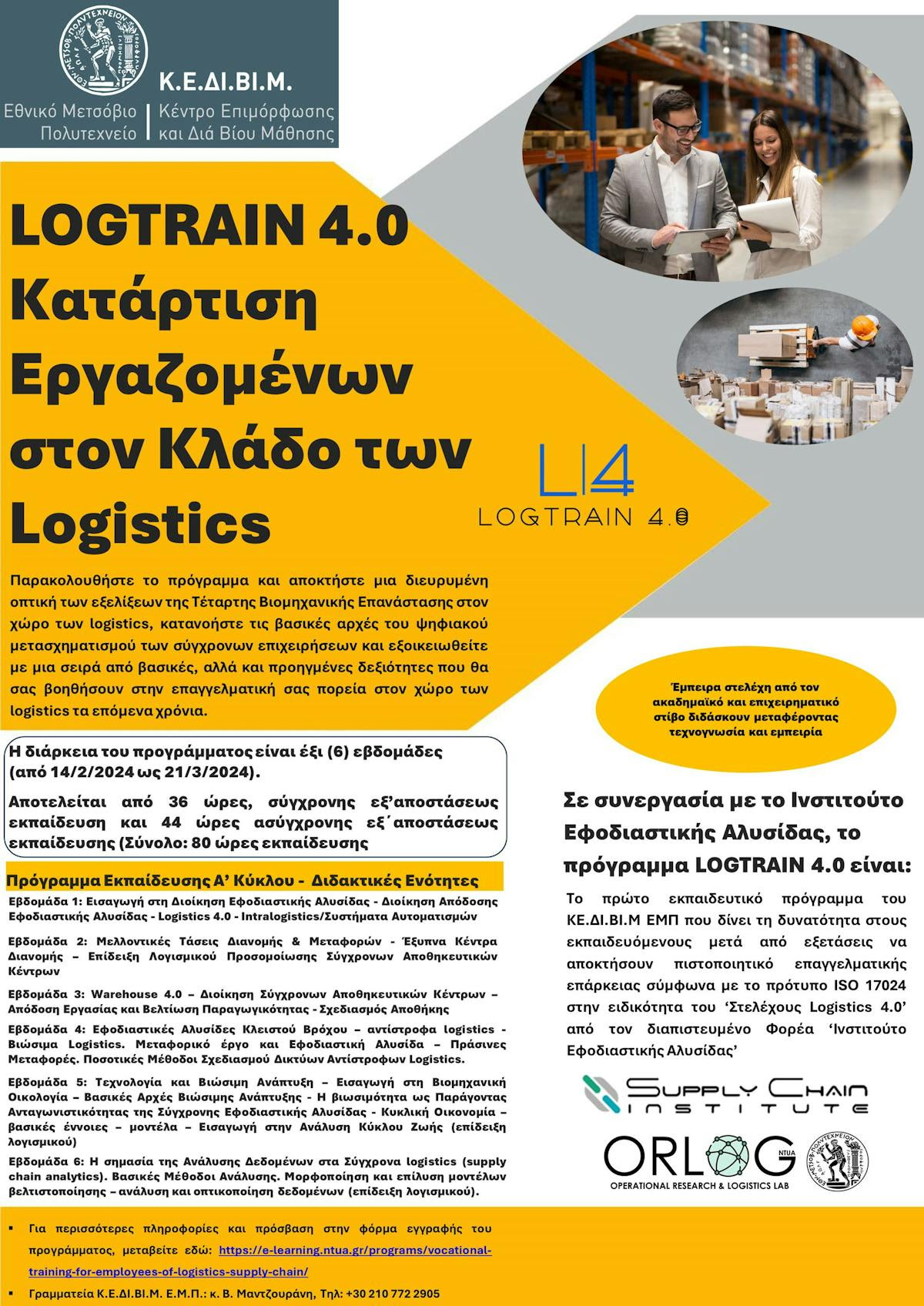 Το Κέντρο Επιμόρφωσης και Δια Βίου Μάθησης του Εθνικού Μετσόβιου Πολυτεχνείου και το Ινστιτούτο Εφοδιαστικής Αλυσίδας ενώνουν τις δυνάμεις και την τεχνογνωσία τους, και εκπαιδεύουν και πιστοποιούν επαγγελματίες στην ειδικότητα «Στέλεχος Logistics 4.0».