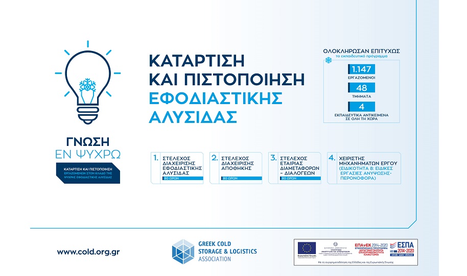 Στην ετήσια εκδήλωση της Ελληνικής Ένωσης Βιομηχανιών Ψύχους & Logistics, που πραγματοποιήθηκε με την παρουσία του Αναπληρωτή Υπουργού Ανάπτυξης & Επενδύσεων κ. Νικόλαου Παπαθανάση, παρουσιάστηκαν τα αποτελέσματα του μεγαλύτερου εκπαιδευτικού Προγράμματος στον χώρο των Logistics «ΚΑΤΑΡΤΙΣΗ ΚΑΙ ΠΙΣΤΟΠΟΙΗΣΗ ΕΡΓΑΖΟΜΕΝΩΝ ΣΤΟΝ ΚΛΑΔΟ ΤΗΣ ΨΥΧΡΗΣ ΕΦΟΔΙΑΣΤΙΚΗΣ ΑΛΥΣΙΔΑΣ» μέσω ΕΣΠΑ.