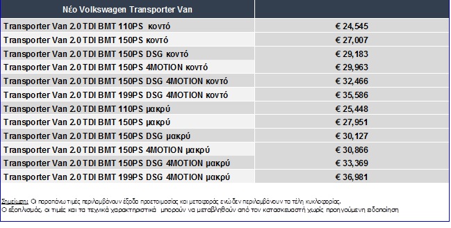 Oι τιμές του νέου Transporter 6.1 VAN διαμορφώνονται ως εξής: