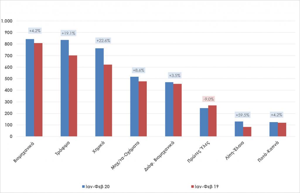 Λαμβάνοντας υπόψη τους δύο πρώτους μήνες του 2020, οι ελληνικές εξαγωγές κινήθηκαν ανοδικά και ανήλθαν στο ποσό των €5.474,4 εκατ., έναντι €5.198,2 εκατ. στο αντίστοιχο διάστημα του 2019, σημειώνοντας αύξηση κατά €276,2 εκατ., δηλαδή 5,3%. Άνοδο σημείωσαν και οι εισαγωγές και συγκεκριμένα κατά €190,8 εκατ., δηλαδή 2,1% με αποτέλεσμα να διαμορφωθούν σε €9.069,3 εκατ., ενώ το εμπορικό έλλειμμα μειώθηκε κατά €85,4 εκατ., δηλαδή 2,3% και ανήλθε σε €3.594,9 εκατ.