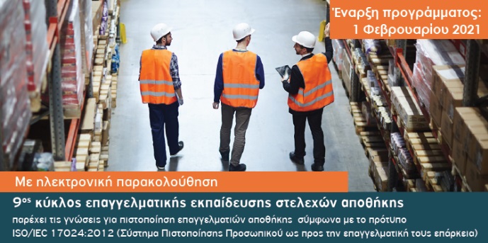 Την 1η Φεβρουαρίου ξεκινά ο 9ος κύκλος επαγγελµατικής εκπαίδευσης στελεχών αποθήκης που διοργανώνει το Supply Chain Institute. Παρέχει τις γνώσεις για πιστοποίηση επαγγελµατιών αποθήκης σύµφωνα µε το πρότυπο ISO/IEC 17024:2012 (Σύστηµα Πιστοποίησης Προσωπικού ως προς την επαγγελµατική τους επάρκεια).