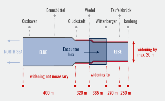 From yesterday, vessels with a combined width of up to 98 metres may pass each other in a widened section of the Elbe known as the ‘passing box’. The five-kilometre stretch under Federal jurisdiction now has a width of 385 metres.