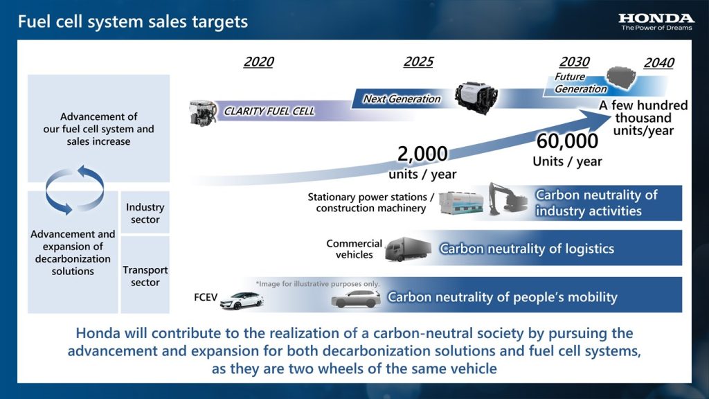 Με δεδομένες τις περιβαλλοντικές τάσεις που παρατηρούνται ανά τον κόσμο, η Honda θα συνεχίσει να επεκτείνει την εφαρμογή των συστημάτων κυψελών καυσίμου της, που αποτελεί τον πυρήνα της τεχνολογίας υδρογόνου της μάρκας, πέραν των FCEV μοντέλων της, προκειμένου να συμβάλει στην επίτευξη μιας κοινωνίας με ουδέτερο ισοζύγιο άνθρακα. Για το σκοπό αυτό, η Honda θα ξεκινήσει τις εξωτερικές πωλήσεις των συστημάτων κυψελών καυσίμου επόμενης γενιάς περί τα μέσα της δεκαετίας του 2020. Η Honda οραματίζεται ότι αρχικά οι πωλήσεις θα φτάνουν τις 2.000 μονάδες ετησίως και θα προσπαθήσει να τις επεκτείνει σταδιακά, με στόχο να αυξηθούν στις 60.000 το 2030 και σε μερικές εκατοντάδες χιλιάδες ετησίως μέχρι το δεύτερο μισό της δεκαετίας του 2030.