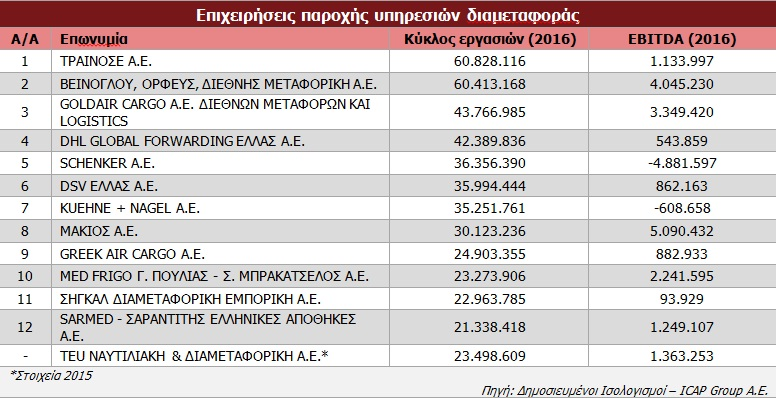 Στον πίνακα που ακολουθεί παρουσιάζονται ορισμένες εκ των κυριότερων εταιρειών που συμπεριελήφθησαν στην κλαδική μελέτη Υπηρεσίες Διαμεταφοράς, με δημοσιευμένο κύκλο εργασιών άνω των 20 εκατ. ευρώ για το 2016. Βασική δραστηριότητα των αναφερόμενων εταιρειών είναι η παροχή υπηρεσιών logistics και διαμεταφοράς σε τρίτους.