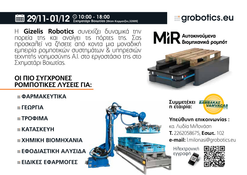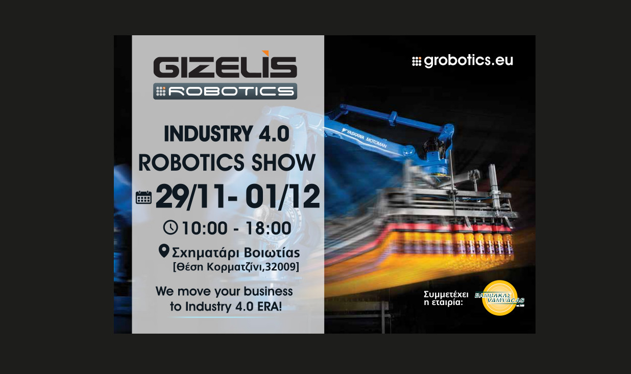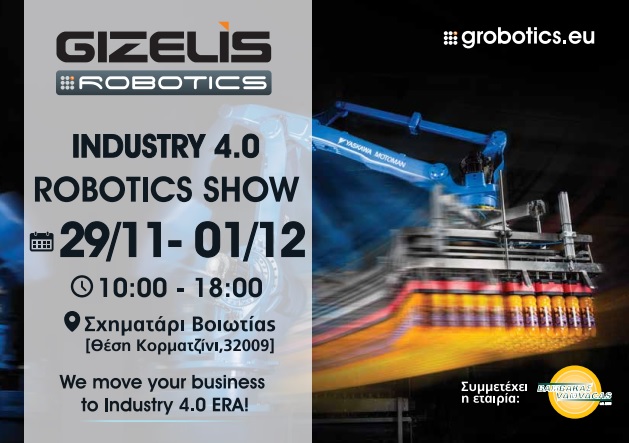 Μια ακόμα πρωτοποριακή πρωτοβουλία αναλαμβάνει η εταιρεία Gizelis. Ανοίγει το εργοστάσιό της στο Σχηματάρι Βοιωτίας, από τις 29 Νοεμβρίου μέχρι και την 1η Δεκεμβρίου 2019, ώρες 10:00 – 18:00, για να παρουσιάσει μια μοναδική εμπειρία, το INDUSTRY 4.0 ROBOTICS SHOW.