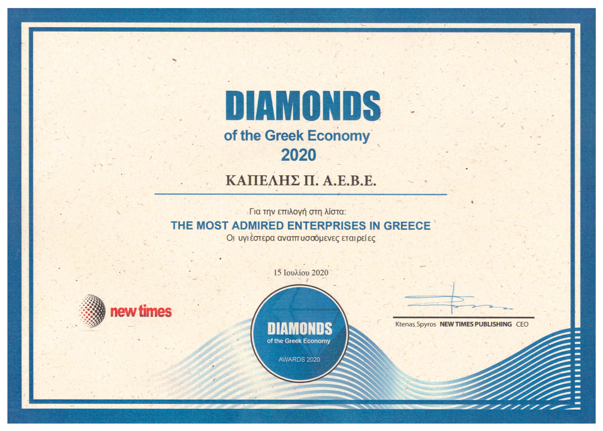 Η Kapelis Packaging διακρίθηκε ανάμεσα στις δυναμικότερες Ελληνικές επιχειρήσεις και βραβεύτηκε ως Diamond of the Greek Economy 2020” για την υγιή και αναπτυσσόμενη επιχειρηματική της δραστηριότητα. Η εκδήλωση “Diamonds of the Greek Economy Awards” διοργανώθηκε από την εταιρεία New Times Publishing. Η συγκεκριμένη διάκριση αναδεικνύει τις δυναμικότερες και υγιέστερες ελληνικές επιχειρήσεις, στηριζόμενη σε συγκεκριμένους οικονομικούς δείκτες και κριτήρια όπως η κερδοφορία, η δανειακή επιβάρυνση, η ρευστότητα, η σχέση ιδίων προς ξένα κεφάλαια κλπ. Ταυτοχρόνως συνυπολογίζονται συγκεκριμένοι παράγοντες όπως τα επενδυόμενα κεφάλαια από μέρους των εταιρειών, η πολιτική τους στο ανθρώπινο δυναμικό καθώς επίσης και η αντίστοιχη σε θέματα εταιρικής και κοινωνικής ευθύνης.