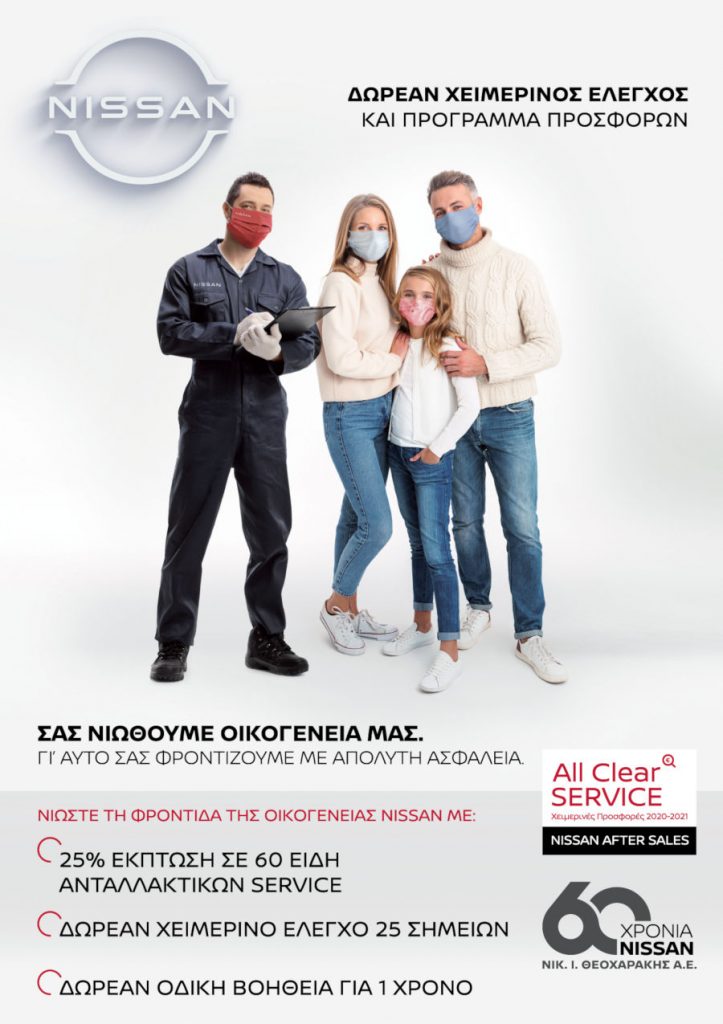 Με κεντρικό σύνθημα «Σας νιώθουμε οικογένειά μας. Γι’ αυτό σας φροντίζουμε με απόλυτη ασφάλεια», η Nissan θέλει να τονίσει, μέσω του χειμερινού προγράμματος προσφορών All Clear Service, τη σπουδαιότητα της υγιεινής και ασφάλειας και στο After Sales Service, στην εποχή της πανδημίας Covid-19 στη χώρα μας.