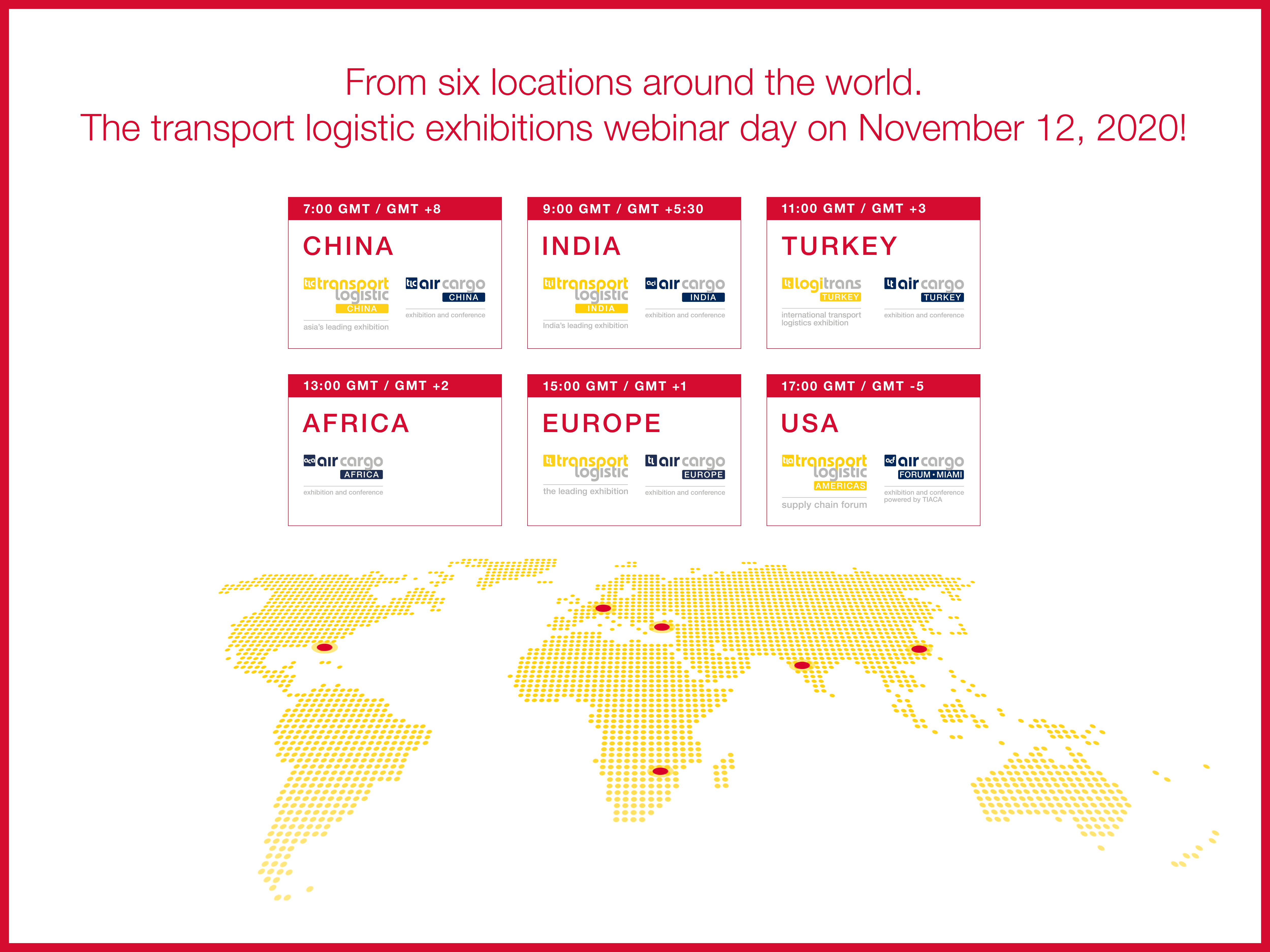 Due to the worldwide corona pandemic, all foreign events of the transport logistic network had to be cancelled this year. With the Global Webinar Day, industry representatives are therefore now offered a digital alternative to virtually meet and exchange knowledge in one day across all time zones. Various webinars will be held on November 12, 2020 at the six transport logistic / air cargo locations around the world. Here, decision-makers and experts from the logistics industry will share current assessments and provide valuable market insights. In addition, they will be available to participants to answer questions interactively and discuss opportunities and challenges in the market.